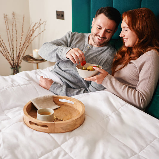 • A couple sit up in bed covered by their heated duvet eating fruit in bed