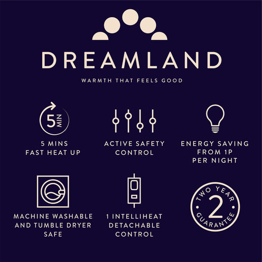Featuring Intelliheat Technology, it adjusts to your body’s temperature for a perfectly warm sleep every night. Machine washable and tumble dryer safe, it’s as easy to care for as it is to love. Lower the thermostat, elevate your comfort, and drift into Dreamland in ultimate warmth. King size 225X220cm, dual controls.